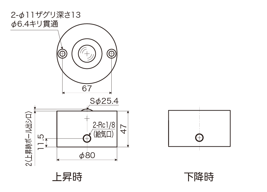 上昇は空気圧で行い、下降はワークの自重で行います。そのため、下降時はシリンダー内の空気を開放する必要がありますので、三方口弁をご使用ください。